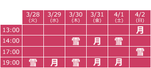 | 公演期間 | 2017/3/28(火)~4/2(日) 3/28(火) 19:00 雪 3/29(水) 19:00 月 3/30(木) 14:00 雪 / 19:00 雪 3/31(金) 14:00 月 / 19:00 月 4/01(土) 14:00 雪 / 19:00 月 4/02(日) 13:00 月 / 17:00 雪 ※【一部Wキャスト:雪チーム/月チーム】 ※ロビー開場は開演の1時間前、客席開場は開演の30分前です。 |