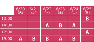| 公演期間 | 2017/6/20(火)~6/25(日) 6/20(火) 19:00 A 6/21(水) 19:00 B 6/22(木) 14:00 A / 19:00 B 6/23(金) 14:00 B / 19:00 A 6/24(土) 14:00 A / 19:00 B 6/25(日) 13:00 B / 17:00 A ※開場は、開演の30分前です。 ※本公演はWキャスト公演です。 |
